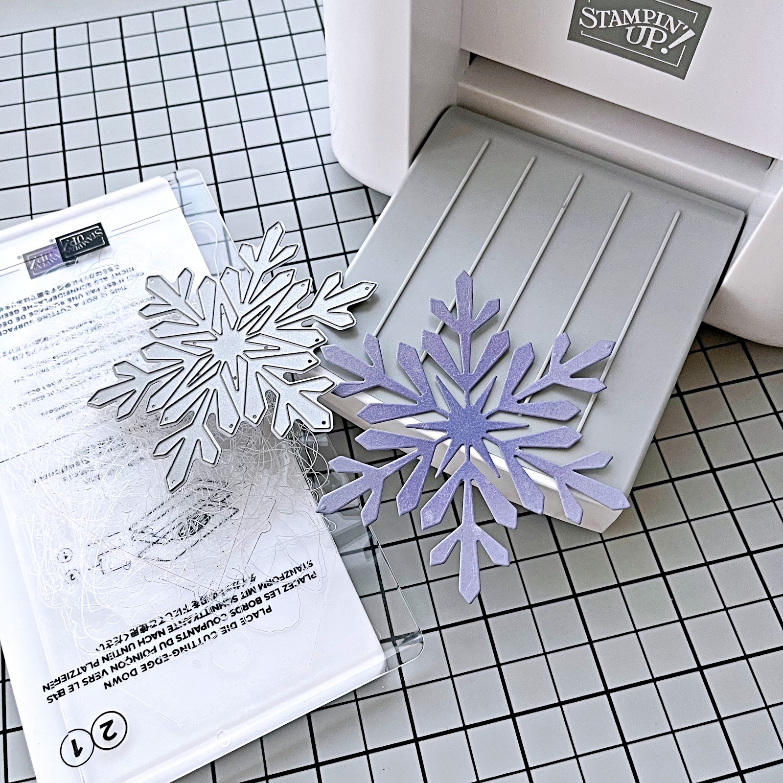 Step 5: Using the same VersaFine Clair inks (Lilac Bloom and Very Peri), ink blend the center of a square piece of cardstock. Then die cut a large snowflake with Hero Art’s Snowflake die. If your snowflake die does not have thin, intricate lines, you could die cut the shape before ink blending.