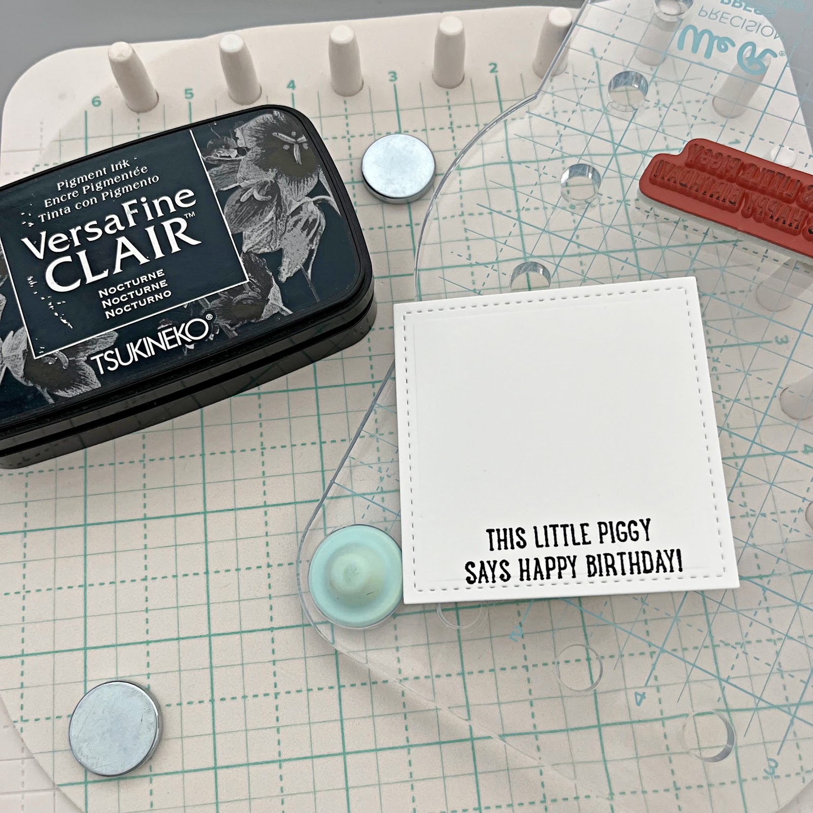 Step 2: Die cut a piece of cardstock and stamp the piggy image onto the scalloped square piece. I used the Memento Tuxedo Black ink. It is a great ink for stamping if you want to color your images with alcohol markers.